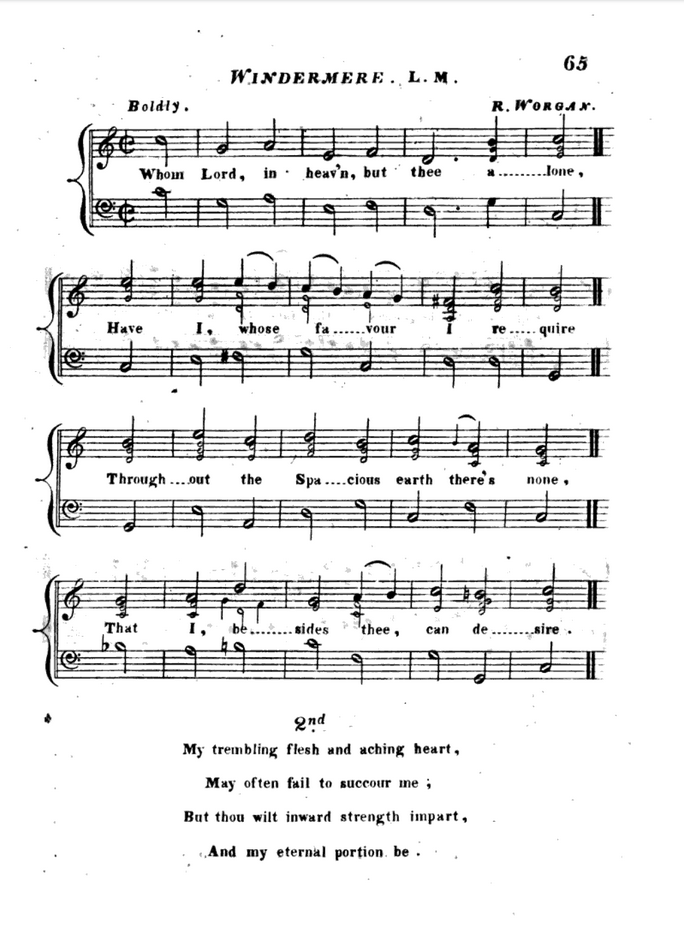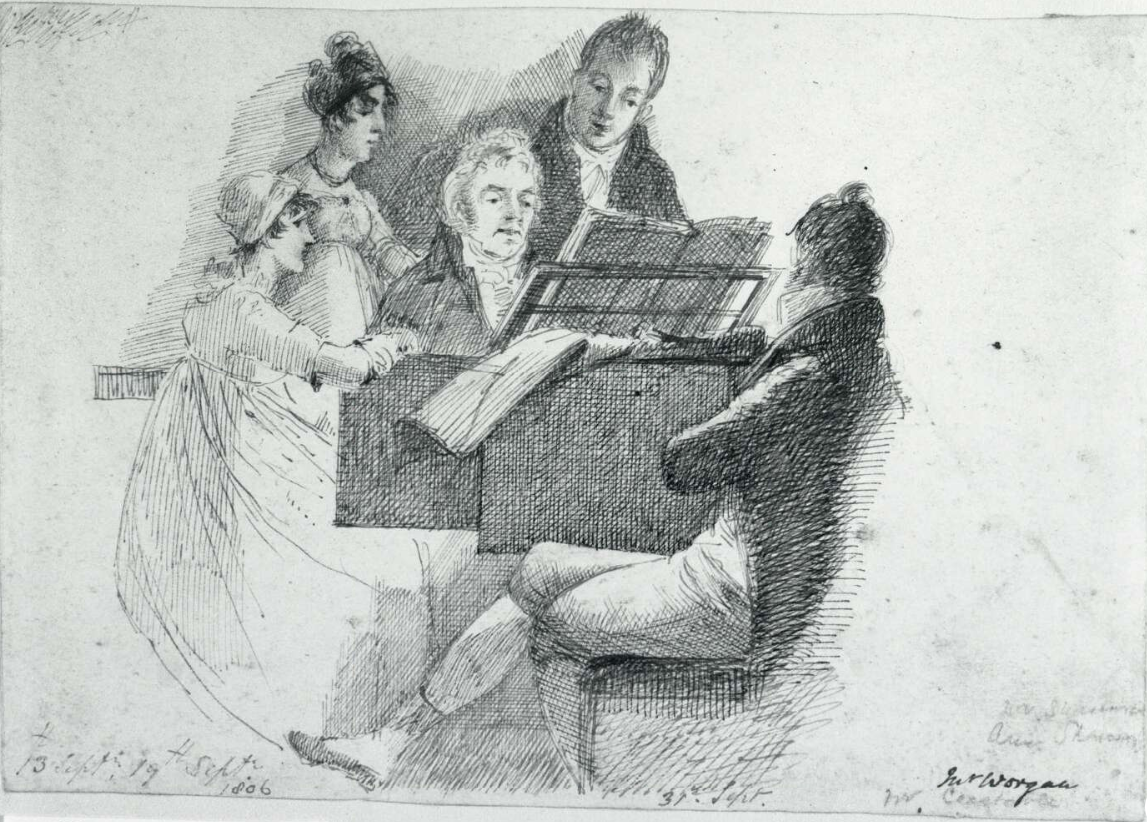 David Pike Watts was the brother of Ann Constable, mother of the painter John Constable, and it was David Watts who encouraged John to visit the Lake District in the Autumn of 1806, paying his expenses to enable him to pursue his artistic calling. Finding Lakeland uncongenial, however, Watts sold Storrs Hall at that time, so Richard Worgan must have come to some arrangement with the new owner John Bolton to continue to live in the cottage. So, when John Constable and his friend George Gardner arrived at Storrs on 1st September they stayed for a week, not with Constable’s uncle, who had already sold up, but with Richard, before moving on to Brathay Hall and the Hardens. Drawings by Constable and by John Harden show Richard at Brathay where he entertained the company on the piano. While still living in the area Richard made a setting of some sonnets ‘Dedicated to Mrs B Gaskell of Thornes House by her friend Richard Worgan of Windermere’. The former Mary Brandreth, she had married Benjamin Gaskell MP in 1807, the date indicating that Richard’s residence in the Lake District had continued. His links with Yorkshire also continued, Thornes House being in Wakefield. He also composed a piano piece entitled ‘Windermere’ to which words were later set when it was included in Gems of Sacred Melody, a collection compiled by Richard’s nephew, George, son of his youngest brother Joseph, that was published in 1841.